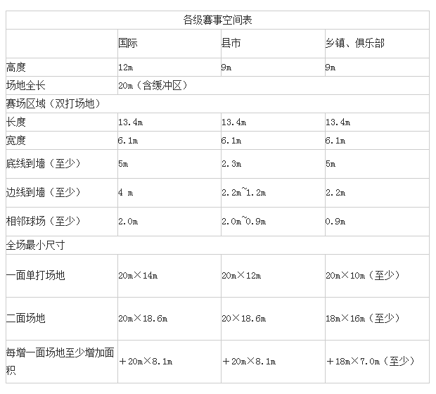 按行業(yè)比賽規(guī)定,整個球場上空空間 低為9米,在這個高度以內(nèi),不得有任何橫梁或其它障礙物,球場四周2米以內(nèi)不得有任何障礙物。任何并列的兩個球場之間, 少應(yīng)有2米的距離。球場四周的墻壁 好為深色,不能有風(fēng)。